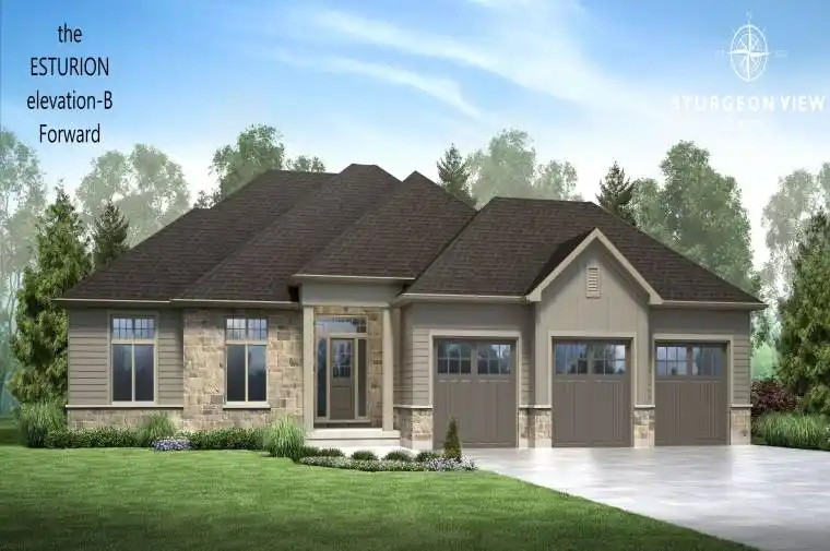 The Esturion featuring 2000sq.ft. Elevation “A” double car garage (third bay optional) forward facing. Visit Sturgeon View Estates, have your home built or purchase one of the last two Models standing and ready for occupancy. Models range from 1766sq.ft. to 2153 sq.ft. , walkout and split grade lots available all with the use of a private community 160ft. dock on Sturgeon Lk. On site Super to give attention to detail and assist you with the building process. The block known as 27Avalon is under POTL, with a monthly fee projected at $66.50, this is the shared waterfront ownership of Sturgeon Lake. Peace and Serenity are all here, just 1 1/2 hrs from GTA, 15 min. to Bobcaygeon and Fenelon Falls. The Model is Elevation A, forward facing.