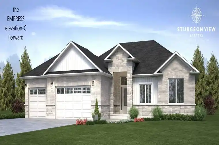 The Empress, 1766 sq.ft. Custom built home on oversized lot with forest in the backyard and full walk out basement! Featuring 3 Bedrooms, ensuite bath, walkin closet in Primary Bedroom. Great Room finished with gleaming hardwood floors, open concept to Kitchen. Choose your Elevation finish, this Model is featured as “A”with forward facing double car garage (third bay optional). Fibre Optics recently installed for the best in high speed internet. Short stroll to the private docking for Sturgeon View Estates, offering 160’dock. Sturgeon Lk. part of the Trent Severn Waterway. Tarion Builder attention to detail. Situated between Bobcaygeon and Fenelon Falls, and just 5 minutes from a Golf and Country Spa, which offers dining and accommodations, along with a public golf course. Book your showing and tour our standing Models! POTL is for the block of land to the dock, known as 27 Avalon Dr., $66.50 a month for maintenance and Reserve Fund. All homes are Freehold. Picture is The Empress Elevation C forward facing.