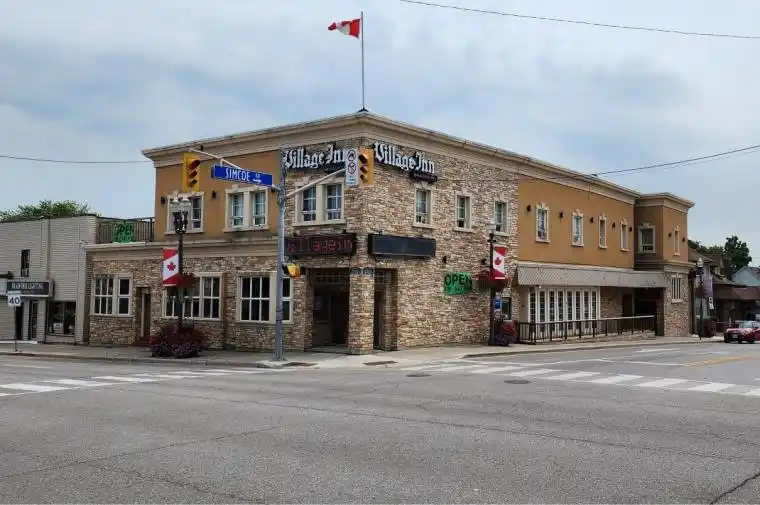 The Landmark building of Bradford! Located at the “Four Corners” centre of downtown. Bring your business to this booming municipality! Tremendous signage opportunities. Close to the future redevelopment site for the new Town Hall complex. Free municipal parking across the road. BONUS large drive-in door to indoor heated loading / storage area (or covered future patio!). 8,517 sq.ft. main floor fitted out as restaurant / entertainment space with full kitchen + coolers + freezers + multiple washrooms. * 5,262 sq.ft. basement of finished space (bar, washrooms, kitchen, cooler, freezer, offices) is also available for a discounted rental rate. Flexible zoning. Permitted uses include: Fitness Centre; Medical Office; Place of Worship; Event Centre; Restaurant; Retail Store; Private School; Specialty Food Store; Offices; Supermarket +++.