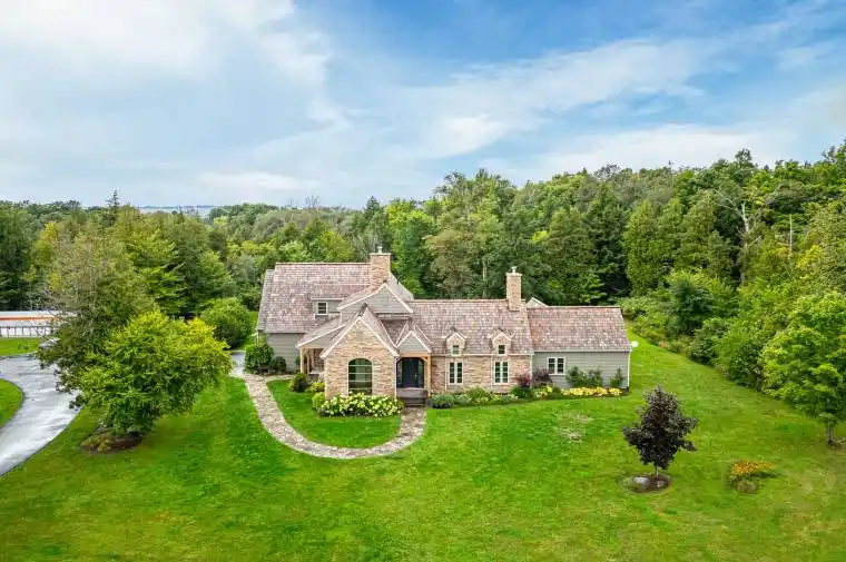 Rarely does a property of this caliber become available! Spanning 20 expansive acres just outside Thornbury and Clarksburg on Grey Rd. 13, this estate is a true gem. A newly paved, winding driveway leads you to a secluded residence thats been meticulously designed for comfort and style. The 3000+ square-foot home features a gourmet kitchen equipped with stainless steel appliances, honed marble counter tops, terracotta floors, and a fireplace surrounded by built-in cabinetry. The main floor primary bedroom boasts a generous en-suite bathroom and a spacious walk-in closet. The great room impresses with its soaring ceilings and another elegant fireplace. Currently serving as a music room, the formal dining area also includes a built-in office cupboard. Upstairs, you’ll find two generously sized bedrooms, while the lower level offers a large gym and sauna. Several walkouts lead to a stunning 16×32 saltwater pool and a pool house. The cement pad is perfect for skating in winter and doubles as a pickleball court in warmer months. An attached double garage provides convenient access to both the main floor and lower level, while a detached 4-car garage with in-floor heating offers ample vehicle storage. The upstairs bonus space is finished, ideal for guest accommodations. A second winding paved driveway leads to the equestrian area, which features a remarkable 4-stall barn with hydro, water, and a spray-foamed loft. There are two paddock areas with shelters and a riding ring. A charming bunkie with tiered decking overlooks two picturesque ponds, and to complete this extraordinary property, the Beaver River gracefully flows along the entire western boundary!