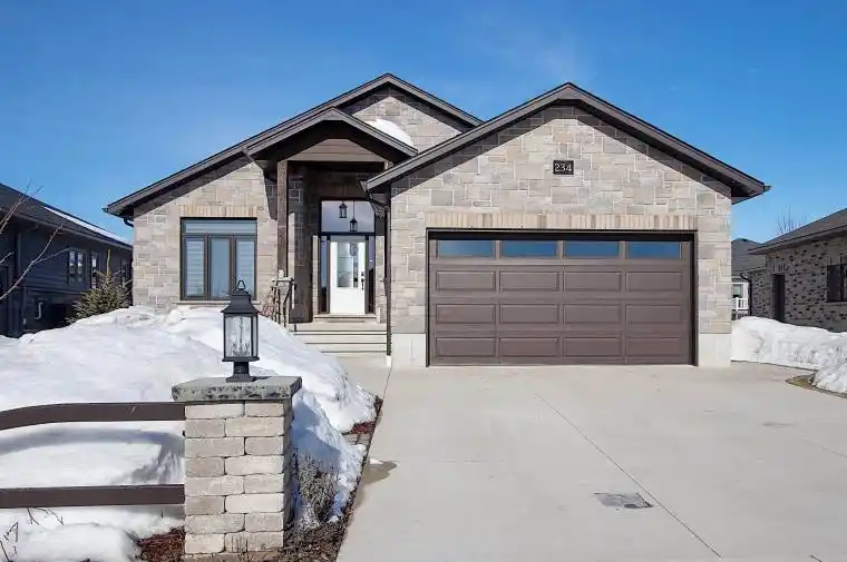 Discover the charm and modern appeal of 234 Matheson Drive! Built in late 2018, this beautifully crafted brick and stone bungalow offers five bedrooms, three bathrooms – all within a thoughtfully designed layout. Step inside to an inviting open-concept living space with vaulted ceilings, seamlessly connecting the kitchen, dining, and living areas ideal for hosting and everyday gatherings. The main floor features a spacious primary suite with a walk-in closet and ensuite, complemented by two additional bedrooms and a full bathroom. Downstairs, the fully finished basement expands your living space with two additional bedrooms, a bathroom with in-floor heating, a large rec room, a cozy hobby nook, and plenty of additional storage. Outside, enjoy the landscaped yard from the welcoming front porch, or unwind on the back deck. A two-car garage and concrete driveway offer ample parking. The homes prime location, just steps from Mitchell Golf Club and a short walk to downtown provides both convenience and a peaceful neighborhood setting. This is more than just a house; it’s a place to call home. Book your private showing today!