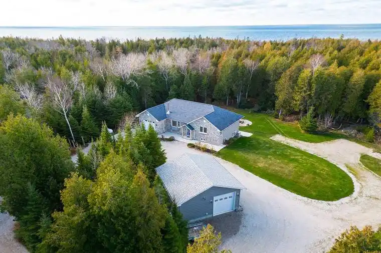 DO YOU DREAM OF A LIFE OF PEACE AND TRANQUILTIY? This custom built 3 bed, 3 bath home nestled on a serene 2 acre lot is only minutes walk to beautiful Lake Huron. To ensure superior efficiency, this 2850 sq ft home was built with insulated concrete form foundation and heated floors. The open concept main floor features beautiful wood floors, an abundance of windows and skylight for natural lighting, spacious kitchen with large island and living room with wood f/p 2bedrooms and 2 baths. The attached garage allows easy access into the home through a mudroom/laundry room. The w/o basement boasts a modern in-law suite with full kitchen, bath, bedroom and living area, 8.5′ ceilings and offers separate entrance and parking. Entertain family and friends on the large composite deck, under the gazebo or covered patio or gather around the firepit in the evening. All of this and a bonus 24’x24′ insulated and heated shop with 10 ft pull through doors and easy access off the circular driveway. A generator hook up and electric vehicle plug ins at both the house and shop (inside and out). This home has numerous intelligent features and has been loved by the original owners. Star gaze and listen to the distant crashing waves!! Don’t miss out, book your showing today.