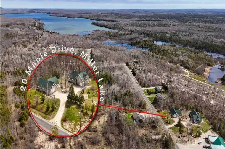 Welcome to 20 Maple Drive in Miller Lake! This lovely and immaculate custom built home is situated on a large lot measuring 166 feet wide x 196 feet deep. Home was built by the original owner & retiring contractor & boasts of character and charm throughout. Inside the home on the main floor, you’ll find a uniquely designed open concept with a living area, dining, and kitchen. The kitchen has an island counter with plenty of storage. If you enjoy baking, preparing meals and entertaining guests, you’ll appreciate the large gourmet cook stove in the kitchen! The living area has a high efficiency woodstove insert that will keep you warm and toasty on those frosty winter days. There is also a bedroom, a three piece bathroom, laundry closet, & an enclosed sunporch/room. The second level has the primary bedroom, a four piece bathroom, and reading nook/study. There is also an open loft that serves as extra sleepovers, office space and or exercise area. Vaulted ceilings. Beautiful wood floors throughout and with in-floor heat. There is an attached garage with in-floor heating that also serves as additional entertainment space. The owners have used it for family and friends’ gatherings. A second building has both an additional 24 X 48 garage with a 2-piece bathroom. There are 3 rooms above the garage that are heated and insulated, and have been used as bedrooms. There is also a 24 x 20 workshop in this second building. It has underfloor heating, and ample power for woodworking machinery. At the end of the day, enjoy a relaxing soak in the hot tub! Property is nicely landscaped. Home shows very well and has been meticulously cared for. Property is located on a year round paved municipal road. Rural services are available such as garbage and recycling pickup. Roads are plowed during winter time. Centrally located between Lion’s Head and Tobermory for grocery shopping, & other amenities. There is a good public access to Miller Lake just a short distance away. Taxes: $3689.00.