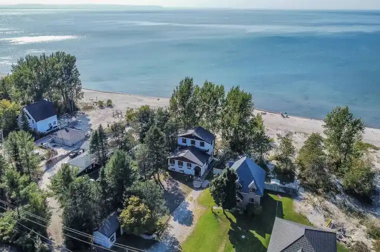 Welcome to the Beach! If you’re looking for stunning waterfront and white sandy beaches, look no further. This spacious five bed, 3 bathroom four season cottage is located on a quiet, family friendly street just north of Edmore Beach in Tiny Township. The open concept main floor offers a kitchen with peninsula, large dining room with space for an oversized table and living room with vaulted ceilings, fireplace and floor to ceiling windows looking out to the bay with a walk-out to the fantastic entertaining deck. The main floor also boasts three bedrooms and one three piece bathroom. Journey upstairs where you will find two more spacious bedrooms connected by a large bathroom offering a shower and jacuzzi tub. Take advantage of the postcard views from the upper balcony. The basement offers great potential for a second entertaining space or space for the kids. The large separate garage at the front of the property provides ample storage and protected parking and the boathouse on the beach side gives you opportunities that are no longer available if you were building new. The home is serviced by a brand new septic system and furnace (2024). Come see for yourself and let your mind run wild with the possibilities of this fantastic property.