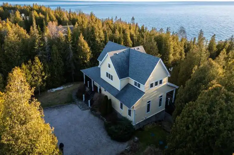 Listen to birdsong and breathe in the soft, cool scent of cedar as you follow a flagstone path to the ocean-like expanse of Lake Huron. Swim, kayak, or hunt with the little ones for fossils, minnows, and crayfish. Marvel at spectacular sunsets, starry skies, and the dazzling Aurora Borealis. Explore the rugged terrain of the Bruce Trail, the sandy beach at Black Creek Provincial Park, and the dive sites at Tobermorys Fathom Five National Marine Park. This fully furnished turnkey cottage, set in Greenough Harbours forested serenity, graces a 1.9-acre lot with 164 ft. of pristine rocky shoreline and western exposure. A covered deck wrapping three sides invites elegant entertaining, quiet reading, or basking in natures beauty. Enter the 3,100 sq ft, professionally decorated home spread over three levels, and be captivated by open-concept living, soaring ceilings, generous windows, and in-floor heating throughout. Host family and friends or retreat to a peaceful nook. With a built-in speaker system and home theatre, every detail gleams in this pristine, modern retreat. The fully equipped custom kitchen features a large island, pull-out drawers, double sink, stainless steel appliances, and a warming drawer ideal for culinary creativity. The spacious primary suite opens onto the deck with a walk-in closet and a 4-piece ensuite with double sinks. Upstairs, a reading loft overlooks the living space with treetop views of the water, while two generous bedrooms boast closets and ensuites. The lower level adds flexibility with a Murphy bed, separate entry, 3-piece bath, laundry, and ample storage for outdoor gear. Explore your own forested landscape, a tranquil Bruce Peninsula ecosystem where little ones can play, and all ages can connect. Original owners – Pride of ownership shown throughout. This property redefines luxury cottage living! Swim by day, stargaze by night, and feel at home.