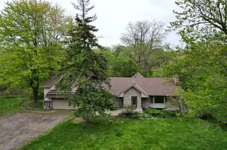 Rare custom-built home with recent renovations, situated on nearly 5.77 acres of private forested land in Waterdown, at the end of a private road. The open-concept interior features a countryside-style kitchen with modern countertops, vaulted ceilings, skylights, and a formal dining room with views of the Grindstone Creek. The living room includes a cozy gas fireplace, and the main floor has two bedrooms sharing a 3-piece bath, plus a laundry room with newer appliances. The spacious master suite on the second floor offers privacy and stunning forest views, with a romantic tub and large 3-piece bath. The finished basement boasts a huge recreation room, full bath, and two separate walk-out entrances to the forest. Ample parking for up to 10 cars, a newer attached two-car garage, and walking distance to schools, parks, shops, and dining make this a perfect blend of seclusion and convenience. zoning is R1-6(H), CM.