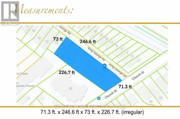 17,244 sq. ft. assembly of residential land for sale for potential to build 34-40 towhouses (buyer to do their DD); located on 40 & 42 Church St. and 4 & 6 & 8 King George Rd. TORONTO, Approx. 0.4 acres; Frontage 246.6 ft. on King George Rd., Corner property, 2 STREET FRONTAGES; Potential for REDEVELOPMENT to Detached houses, Townhouses, or Stacked Townhouses; PRIME LOCATION NEAR PEARSON INTERNATIONAL AIRPORT; DIRECT ACCESS TO HWY 401, PROXIMITY TO HWY 400 & HWY 427; Proximity to WESTON GO (4 min. Drive); Steps to Humber River; Schools and Universities; Demetrius Catholic School – 8.7 of 10