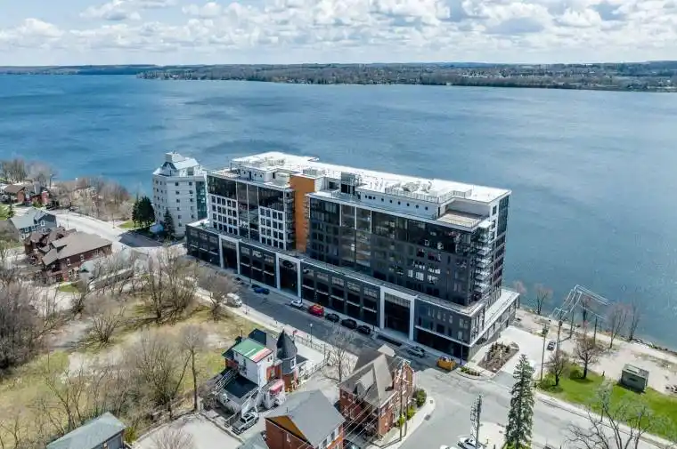 WELCOME to the exquisite Lakhouse condo community in Barrie on the shore of Lake Simcoe’s Kempenfelt Bay. This IMPERIAL Floor Plan offers 1 Bedroom + Den (Office, Guest Rm) + 2 full Baths via a spacious 879 sqft open floor plan with tasteful neutral decor and high-end finishes throughout. Open concept floor plan leads you from the welcoming foyer with double closet and multi-purpose den through the comfortable dining space and on to the floor-to-ceiling windows of the living room that overlook Kempenfelt Bay. Designer galley kitchen with built-in stainless steel appliances, modern smooth front cabinetry, quartz counter tops, plenty of functional workspace and storage. Large windows and sliding doors provide incredible flow of natural light. Stunning primary suite is complete with large closet and privacy of spa-like ensuite – sleek dual sink vanity, glass walled shower, plenty of storage. Modern enclosed balcony with Lumon frameless glass open-air system that allows window panes to easily slide & stack – open to enjoy the breeze from the lake, or closed on cooler days creating a quiet protected sunroom. Dual access to balcony via living room and bedroom sliding doors. Pot lights and track lighting allow you to set the interior vibe, whether day or night. Convenience of full guest bath and ensuite laundry. Experience the luxury of lakefront living. This resort-inspired 10 storey condo offers contemporary Nordic-style and design throughout this suite and into the striking common areas. This is a premiere location for exclusive condo life in the waterfront community of Barrie! Enjoy a leisurely stroll on the waterfront boardwalk, or hike on the Simcoe County trails in all seasons. Easy access to key commuter routes – north to cottage country – south to the GTA. Steps to the amenities for a busy lifestyle – services, shopping, fine and casual dining, entertainment offered by downtown Barrie. Welcome to the luxury and convenience of waterfront condo life in Barrie!