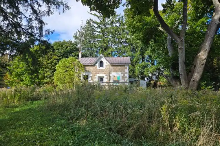 This rare scenic 83-acre property-located just south of Highway 401 and the Village of Moffat, and north of Campbellville on a paved road. A beautiful blend of open fields and mature forest creates an idyllic setting for a private estate, recreational retreat, or future homestead farm. At the heart of the property stands an 1890 Ashlar stone farmhouse with a metal roof. While not heritage-designated, 1.5-storey farmhouse that has withstood the test of time, proudly retaining the timeless beauty of its original exterior. Renovated in the 1950s, it presents an exceptional opportunity to restore or incorporate its impressive stone facade into a truly magnificent custom estate home. Also on the property are the distinctive ruins of a grand 1890s stone bank barn. Though showing its age, the barn’s enduring footprint offers striking potential as a focal point for weddings, family gatherings, or film shoots-making it a unique feature full of rustic character. Zoned A2, the property includes a pond in the north area, regulated by Halton Conservation and a portion of Kilbride Creek running through the northwest corner bordering the Pioneer Creek Trail. The land is not within the NEC per their mapping, allowing more flexibility for building. The property may be subject to HST as it is not currently being farmed. Buyers are strongly advised to consult with their advisors to confirm any tax implications. Convenient access to Hwy 6 and 401, Milton, and Campbellville makes this a superb location for commuters & those seeking a grand country lifestyle close to Town. This is a once-in-a-lifetime opportunity to own legacy farmland rich in history, natural beauty, and endless future potential.