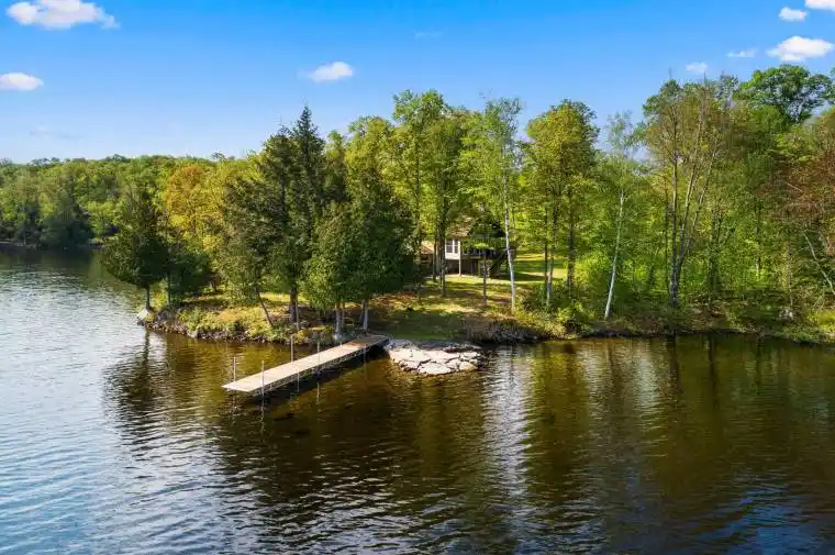 495 feet of waterfront on enviable Buckshot Lake with two cottages and 1.18 acres! The ideal location for your family retreat, or subsidize your summer months with a lakefront rental. Two full cottages separated by a breezeway. The main cottage offers 3 bedrooms with a modern two storey family room with beamed ceilings, and soaring two storey water views. Partially finished basement with concrete block and walkout to yard offers even more potential for a 3rd suite or expand your living/rec space. The second cottage (original cabin) is a sweet bungalow arrangement with 3 bedrooms and spacious living and kitchen. Water views that will take your breath away. Multiple walkouts to private decks and gently sloping lawns all the way to the water’s edge and your private 48′ wood and aluminum dock. Detached dry-boathouse/garage with space to store all your toys. Adorable garden shed with deck and pergola make an ideal bunkie or even an office away from home.