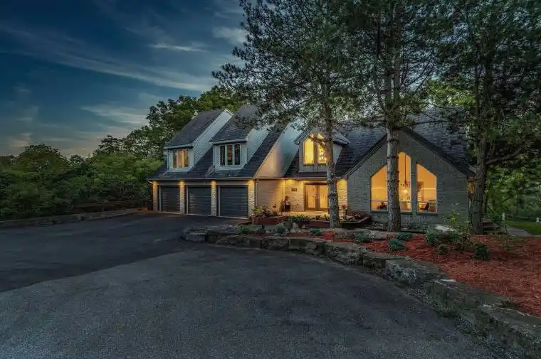 Discover a magnificent architectural masterpiece nestled on a private and tranquil two-acre property a true paradise of extraordinary. This exceptional residence boasts over 7,700 sq.ft of meticulously crafted living space, featuring a show-stopping indoor heated pool that will leave you in awe. As you step inside, you’re greeted by soaring 23 ft cathedral ceilings on the main level, creating a sense of grandeur and space. The open-concept design seamlessly connects the living room and family room to the indoor pool area, offering an unparalleled blend of luxury and relaxation. A modern and spacious Scandinavian kitchen provides a perfect setting for family meals, with panoramic views of the surrounding nature. The lower level is an entertainer’s dream, complete with direct access to the pool, wet bar, and a walkout to the backyard. The sprawling two-acre property spans across Old Dundas Rd and connects to Lower Lions Club Rd, offering additional parking for your RV and boat.