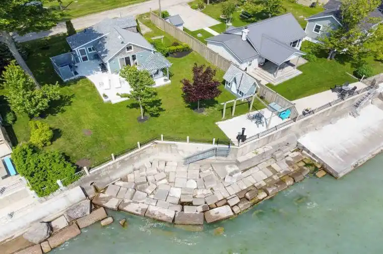 Enjoy the stunning views from this charming waterfront cottage on a quiet dead-end road near Dunnville. This cute and cozy cottage features a Nantucket style with a stylish personality. Inside, you’ll be greeted by a panoramic view of Lake Erie, original wood floors, a fully equipped oak kitchen, and a gas fireplace that adds a nautical touch. The bright living area, with natural light and an open ceiling, feels spacious. Sliding glass doors open to a large south-facing deck and lawn, leading to the waters edge. The main floor has a bright bedroom, and the second bedroom upstairs includes a small sitting area. The cottage’s Nantucket decor is simple yet beautiful, with every room offering a view of the lake. The 3-piece bathroom opens to an outdoor shower and hot tub deck, perfect for enjoying lake views or stargazing. In the evening, relax by the outdoor fireplace area at the water’s edge. This cottage provides total comfort with a casual beach vibe.