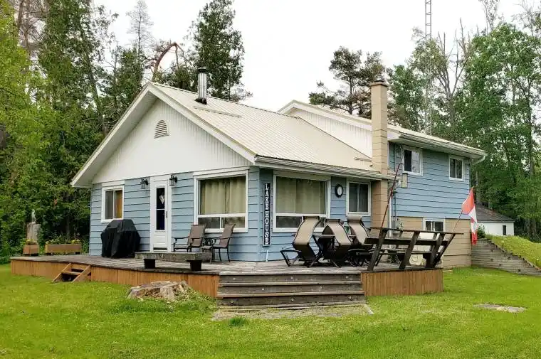 Rare offering – Waterfront without the exorbitant taxes! This freshly updated split level home boasts three bedrooms, a large five piece bath with new vanity and shower stall, finished living space on three levels with walkout to sunroom and backyard, plus an oversized double garage for all your waterfront toys! Enjoy lake views from the open concept main floor kitchen, dining & living room or from the wrap around deck. You’ll love the one acre private beach park attached to this home, with wade in waterfront. Includes 70ft Naylor dock, a pedal boat, and a 14ft fishing boat with trailer. (No motor)