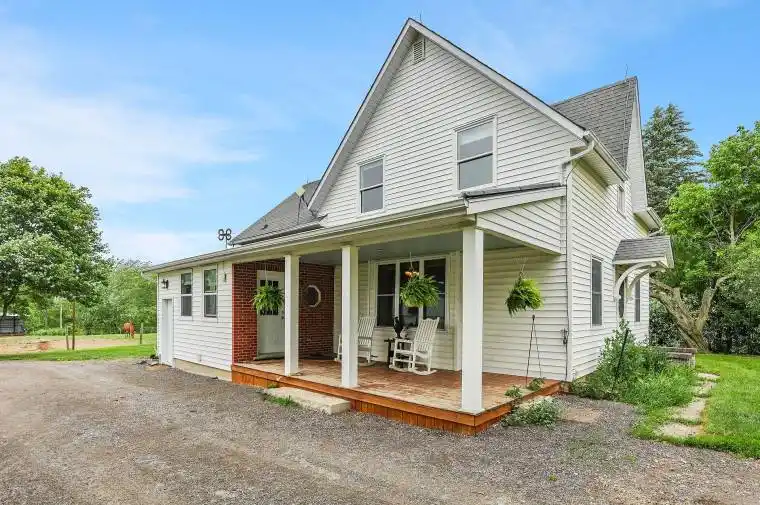 Unbelievable 16.68-acre property featuring a fully renovated 5-bedroom century farmhouse on prestigious Effingham St with 2 road frontages. Numerous well-kept outbuildings include the original 3-storey dairy barn with concrete silo. The lower level houses chickens and geese with a walk-in cooler; the 2nd and 3rd levels showcase exposed hand-hewn beams, planks, a stage area, and 4-piece bathroom. A loft/bar area makes it perfect for parties and events. The original milk house has been converted into a heated, insulated workspace with tile floors, currently used as a wellness/therapy office. A transfer box for a generator hookup has been put in which can run the whole property, natural gas line to this majestic barn. A detached 23 x 35 brick/block shop/garage has 220V power and overhead doors, one 9′ high. Also included are a 50 x 50 implement shed, 50 x 100 coverall, pond, bunkie, and lean-to picnic area. 12 Mile Creek runs through the bush and meadow, home to wildlife like deer and turkeys. Conservation & Ducks Unlimited planted 4000 trees in recent years. Apple, cherry, plum trees, and raspberries grow in the backyard. There’s a good-sized horse paddock with a walk-in shed and frost-free water system. Approx. 5 acres are in cash crop, plus an additional 10 acres rented by the owner, reducing property taxes significantly. A covered side porch leads into a tiled mudroom. A second front entrance opens to a hardwood foyer, original parlor (office), and living room with wide plank floors and French doors. Main floor includes a 3-piece bath, spacious kitchen with granite countertops, laundry room with separate shower and pantry. Step out to a wood deck with a hot tub and gazebo. Upstairs: 5 bedrooms (4 w/wide plank floors) and a 3-piece bath with skylight and glass shower. Full basement with 200 amp service, 1yr new gas on-demand water system, sump pump, central vac, filtration system, and 2yr new central air. Don’t miss this rare opportunity!
