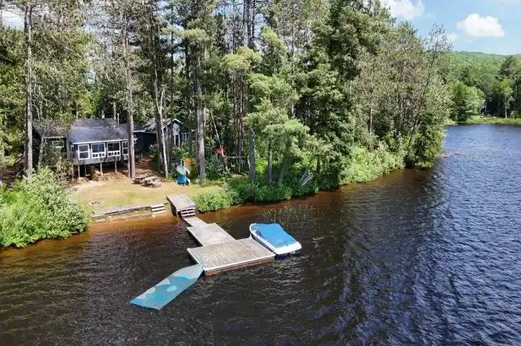 On every lake there are the lots who were chosen 1st way back when the original developments were done. This is one of those lots located here on Benoir Lake. Boasting 750’+/- on the water with 300′ or so on the lake side and 450′ or so on the York River side, this land is not only totally level but has huge, mature trees, a hard packed rippled sand beach facing south and west on the lake with the river part facing more south east. This 4 season accessible property also has a new septic installed in 2014 to handle both the COTTAGE and GUEST HOUSE which allows you to have lots of guests or family to entertain easily with so much room in both! Many upgrades since they purchased in 2010 including complete main floor reno of the cottage, enclosed sunroom, metal roof and more as well as a new guest house in 2014 and so much more. Benoir Lake is joined by water to Elephant and Baptiste Lakes for 35 km of connected boating, fishing and water entertainment but also for the outdoor enthusiast you can canoe/kayak up the York River into Algonquin Park for an outdoor afternoon excursion. Other great things about this general area are the ATV and Snowmobile trails so you can explore the entire region but being located between Haliburton and Bancroft also gives you shopping options. So much to tell best seen in the video presentation but full Buyer Information packages are available so email or call today to book a viewing!