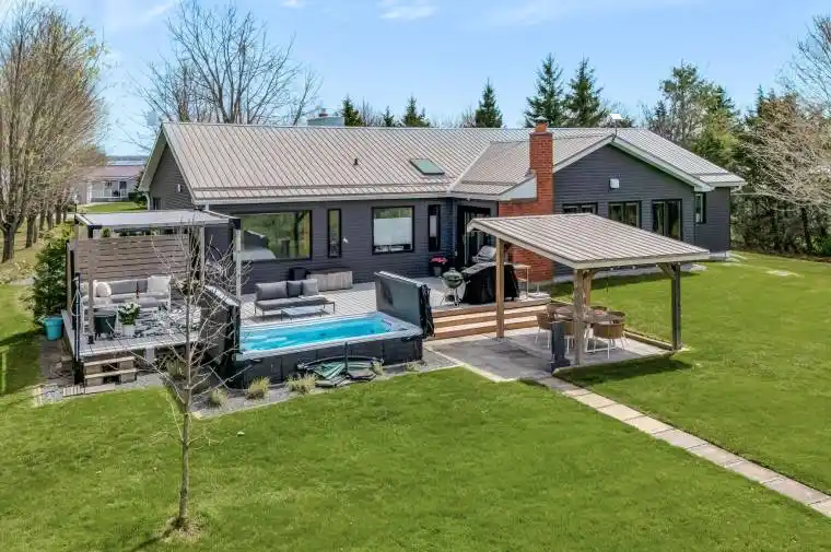 Welcome to 135 Hiscock Shores Road a picturesque retreat tucked away in the heart of Prince Edward County. This exceptional 4-bedroom, 3-bathroom bungalow sits on a beautifully landscaped 3-acre lot, offering your own rural retreat. Inside, you’ll be greeted by soaring vaulted ceilings, sun-filled spaces courtesy of skylights, and a striking double-sided wood-burning fireplace that anchors the open-concept living and dining areas. The chef-inspired kitchen is a true showstopper, featuring an abundance of storage, stainless steel appliances, quartz countertops, a feature wall with an additional wine fridge, and ample room to cook, gather, and entertain in style.The home offers thoughtful functionality throughout, including a full-footprint crawl space for all your storage needs. Step outside to discover your private oasis – enjoy a relaxing soak in the 2020 swim spa with a brand new cover, unwind under the covered canopy, or explore the tranquil 2 km walking trail winding through the back of the property and neighbouring land. Deeded access to the shores of Wellers Bay elevates the experience with even more connection to the natural beauty around you, without the maintenance of waterfront living. Additional highlights include a double attached garage, a dedicated dog run, and a backup generator for year-round peace of mind. Recent updates provide added value, including: roof (approx. 2017), eavestroughs and gutters (2023), heat pump and furnace (2024), and native garden landscaping (2021). Ideally located just a short drive to Trenton, and minutes from the County’s best restaurants, wineries, and breweries. Relax, unwind and call the County home.