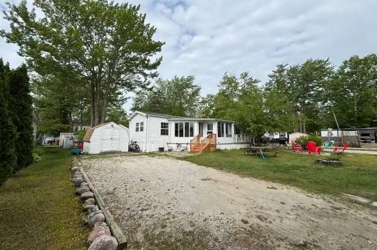 Seasonal retreat in popular Countrylife Resort. (7 months April 26th-Nov 16th). Completely renovated Baycastle Model features a 8×10 plus foot sunroom and is situated on a centrally located lot very close to the sandy shores of Georgian Bay. Parking for two cars onsite plenty of visitor parking close by. 2 bedroom 1 bathrooms. Low maintenance exterior. Landscaped yard with expansive decks and corner lot. This Cottage is ready for your family to start enjoying the summer! Resort features pools, splash pad, clubhouse, tennis court, play grounds, mini golf and short walk to the beach. Gated resort w/security. This unit has been very well maintained and is a pleasure to show! Seasonal Site fees for 2025 are $5,800 plus HST