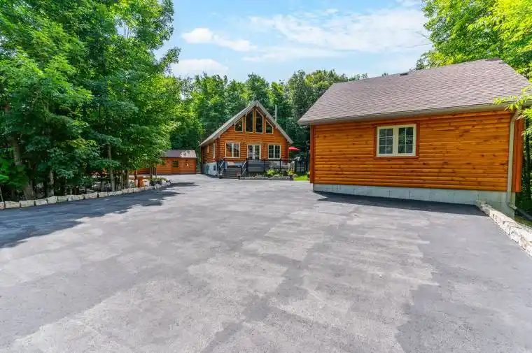 One owner, immaculate and fully furnished 4 bed 3 bath Sauble Beach retreat with Fibre Optic Internet and Natural Gas. Over 2100 finished sq ft of living space, situated on a half acre private lot with a large 2 car (600 sq ft)detached, insulated and heated shop/garage. As you drive up the circular, paved drive you will find the most meticulous and well cared for lawn and perennial beds in a completely private setting where you can spend the afternoon under the trees or on the wrap around 800′ of no maintenance composite decking with plenty of room to entertain plus a sunken hot tub to enjoy after a long day at the beach. As you enter the gorgeous, low maintenance Natural Log Sided home you will find pride of ownership in every room. The open concept main floor living area is flooded with natural light, compliments of the wall of windows, a bright updated kitchen with white cabinets and black sparkling granite countertops complete with all newer stainless appliances(2022) and high end plumbing fixtures. On the main level you will also find 2 nice size bedrooms, laundry room a 4 piece bath and gorgeous solid maple flooring throughout. Head to the upper level where you will find a large primary suite offering tons of closet/cabinet space, a 4 pc ensuite bathroom and a compact/bright office cove at the top of the stairs. Next find your way to the fully finished lower level to enjoy a relaxing rainy day indoors! Waiting there is a generous size games room with both a pool table and shuffle board (incl), large extra bedroom, office/den and a 3rd 2 pc bathroom. Bathrooms all have high end plumbing fixtures and granite counters. Incase you need extra space to store your lawn and garden tools there is a 10’x16′ garden shed plus another 10’x32′ fully insulated outbuilding offering another 480 sq ft of space for extra storage or could be easily transformed into bunkies for overflow guests. All you need to do is move in and enjoy!