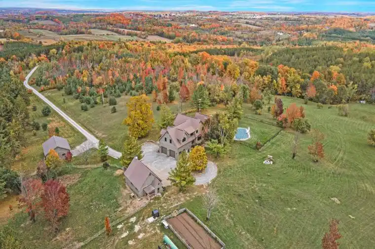 A breathtaking property! The ultimate in privacy and serenity! This unique and elegant home offers incredible views from each room, with over 6,800 square feet of living space. High ceilings; built-in speakers throughout; high-end trim work; large, stately rooms; lovely landscaping with perennials, flagstone patio and walkways. Live off the land with your very own veggie and herb gardens, maple syrup, fruits from the orchard and fresh eggs; approximately 30 acres with walking trails. You can live off grid by simply adding solar panels. New boiler/heat exchanger heats entire home with wood, or you can use propane if you’d rather, or mix it up – the luxury is in having a choice. 2+ car garage with oversized doors and radiant floor heating is attached to the home. Another detached 2 car garage + garden shed with chicken coop, plus a third, detached 3+ car garage/workshop with radiant floor heating and ICF construction. Metal roof on all buildings. Less than 30 minutes to Hwy 407. Your search ends here!