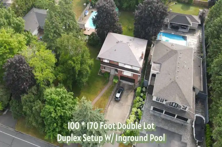 DOUBLE 100 BY 170 FT LOT!! Possible buyer due diligence could lead to lot severance to maybe keep the existing home and build on the severed lot. Offers anytime. Home is set up like a duplex but can easily be converted into a one family home. Main floor 1 bedroom unit features a large living room with gas fireplace and large front facing window, kitchen with pantry, dining room, 4 piece bath and bedroom with a walkout to deck. Upper 2 bedroom unit features a large living room with gas fireplace and large front facing window, eat in kitchen with built in appliances, huge pantries, skylight and walk out to deck, dining room with additional walk out to deck, 4 piece bath, and 2 bedrooms. Upper unit has flat ceilings. Hardwood stairs, wainscotting and crown molding throughout most of the home. Basement includes a rec room with built in bar and garage access. Metal roof. Newer furnace. Air conditioner 24. Huge yard with inground pool, shaded covered areas, pool house and pond/water feature.