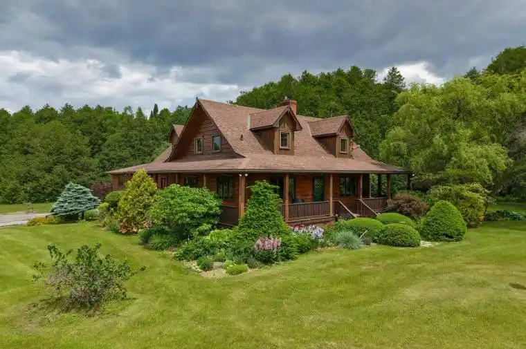Set at the very end of a quiet dead-end road, down a newly paved, winding driveway, this genuine 10-inch square log home delivers a rare mix of charm, comfort, and privacy across more than 20 acres of untouched land. Surrounded by mature trees and lush landscaping, the home exudes warmth and timeless charm. The welcoming foyer opens to a covered wraparound porch, ideal for relaxing or entertaining. Inside, the open-concept kitchen features an island and a five-burner gas stove, flowing into a bright dining area. The living room offers cathedral ceilings, a gas stove with a reclaimed brick chimney, southeast exposure, and a walkout to the covered porch, perfect for enjoying peaceful views year-round. Open stairs lead to both the loft and the lower level. The north wing features four bedrooms and a charming sitting room that overlooks the living space below, with eight-inch antique pine plank floors, cathedral ceiling, and built-in cupboards. Double French doors open to the primary suite with cathedral ceilings, antique plank floors, a four-piece ensuite, and a separate Jacuzzi tub. The home also offers 200-amp service, lower-level laundry, an oversized double garage with double doors and space to park four vehicles, and central vacuum. A detached shop provides a dream space for hobbyists, collectors, or anyone craving room to create, build, or store. Private and secluded, yet just minutes from Uxbridge, this is more than a home, its a lifestyle and a truly one-of-a-kind country escape.