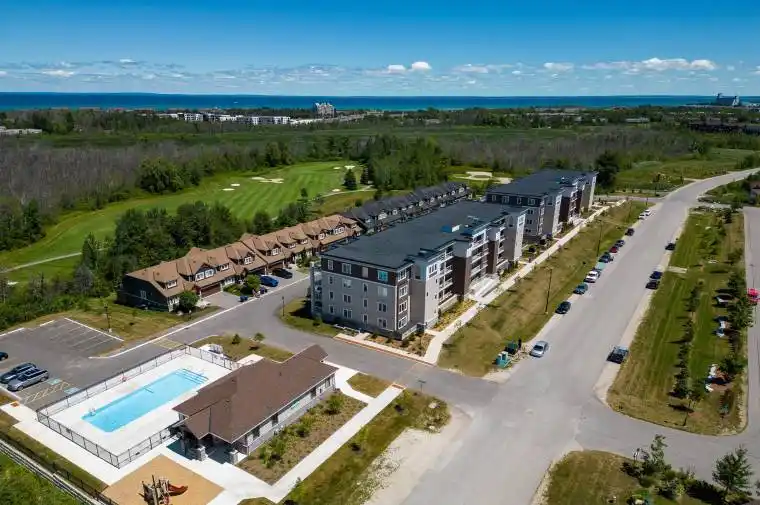 Condo Living At The Most Affordable Price in the Building! The Eagle model offers a bright, open-concept 2-bedroom, 2-bathroom condo with 9-foot ceilings, modern finishes, and a spacious 17’x 8′ balcony with a glass railing perfect for BBQs or enjoying panoramic views of Blue Mountain and the golf course. The stylish kitchen includes granite countertops and stainless steel appliances, while the primary bedroom boasts a chic ensuite with a glass shower. Thoughtful touches like in-suite laundry, private parking, guest parking, elevator access, and a heated breezeway during winter months make life even more convenient. The unit also includes an oversized private storage room measuring 8 ft long by 5.5ft wide by 9.5 ft tall perfect for ski equipment, golf clubs, bicycles, or paddle boards. Residents can enjoy access to fantastic amenities like a fitness center and outdoor pool, making this an ideal home for year-round or weekend living. Best of all, you’re just minutes from golf, beaches, trails, downtown Collingwood, and Blue Mountain Village without the premium price tag.