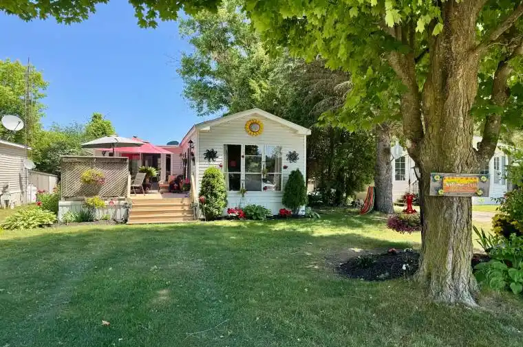 Cozy and well maintained home, situated in popular Lyndhurst golf and park! Wonderful established gardens and mature trees surround this 1 bedroom home, with private deck, and well sized back yard with 2 storage sheds. Approximately 10 minutes from Lake Simcoe, and just under 15 minutes to the Highway 404 extension! Open concept home, one bedroom, 4 piece bathroom with nice sized vanity and a bright 3 season sunroom! Enjoy walking trails, an inground pool, and just steps from a beautiful 18 hole golf course! This home is located on leased land. The lease from April 26th to October 26th is $3575.00 plus HST. Option to stay year round. (40756394)