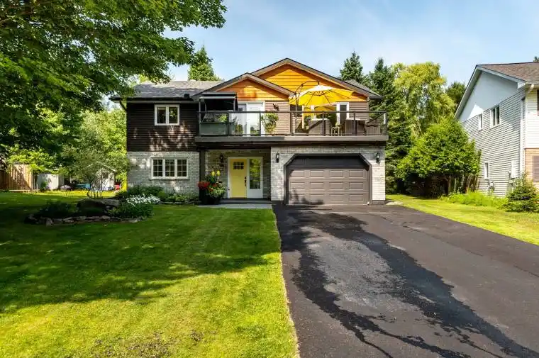 Welcome to this beautifully updated and lovingly maintained family home, perfectly situated in a desirable neighbourhood in Huntsville. With excellent curb appeal, the grey-toned brick and vinyl exterior is complemented by attractive landscaping, a covered entry, and plenty of parking in the double driveway and attached oversized single-car garage. Step inside to a spacious foyer with a large closet, leading into a bright and expansive living room featuring a cozy natural gas fireplace and french doors to the private backyard. The outdoor space offers a patio with a gazebo, a level grassy lawn ideal for kids or pets, and room for gardening. Also on this level is a good-sized bedroom, a 3-piece bathroom with a corner shower, and a versatile office that could serve as a fifth bedroom if needed. A generous mudroom/laundry area offers inside entry to the garage and adds functionality to everyday living. A striking glass railing staircase leads to the upper level, where the heart of the home awaits. The stunning kitchen boasts quartz countertops, a centre island, stainless steel appliances including a stove with a natural gas range, and abundant cabinetry. This open-concept space flows into the dining and living areas, with sliding doors to a sunny deck featuring glass railings, a lounging area, and a covered BBQ space. Upstairs, you’ll also find three generously sized bedrooms, including a stylish primary suite with a walk-in closet and sleek 3-piece ensuite with tile and glass shower. The remaining bedrooms share a well-appointed 4-piece bath. This move-in-ready home is on full municipal services, including water, sewer, natural gas, high-speed internet, and curbside garbage/recycling. Enjoy the convenience of nearby schools, the Summit Centre, shopping, dining, and community events downtown. A thoughtfully improved and well-located home offering space, style, and practicality for families of all kinds.