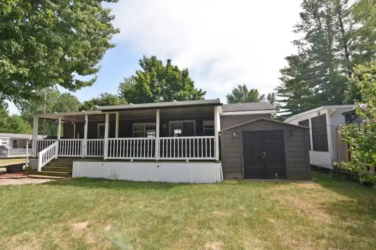2011 NORTHLANDER in OUR PONDEROSA – Seasonal (6 months). Two bedroom / 1 bathroom. Large covered veranda with bar area…great for entertaining or relaxing. Open concept home with an elegant design. Fully furnished. Kitchen includes a gas stove, fridge with icemaker, microwave and lots of cabinets. Dining area with banquette. Living room with fireplace, built-in cabinets, and transom windows. Primary bedroom accommodates a queen bed, double closets and built ins. Second bedroom has bunk beds on both sides…left lower bunk turns into a table and seating area. Updated 4 piece bathroom with tub and shower. Lots of windows throughout. Plenty of storage. Forced-air propane gas furnace and C/A. Surround sound speakers. Wired for satellite tv and internet. Shed is 8′ x 10′. Corner lot with a nice front lawn and firepit area. Home is skirted all the way around. This could be the perfect ” home away from home”. Available from April – October. Fees paid up until end of October 2025. Park amenities include a membership to the 9 hole golf course, 2 pools with waterslide, pickleball, basketball, horseshoes, playground, kids programs, chip wagon and evening entertainment if desired. Just a few minutes to Ipperwash Beach…rated one of the best beaches in Canada. Less than an hour from London, 30 minutes from Sarnia.