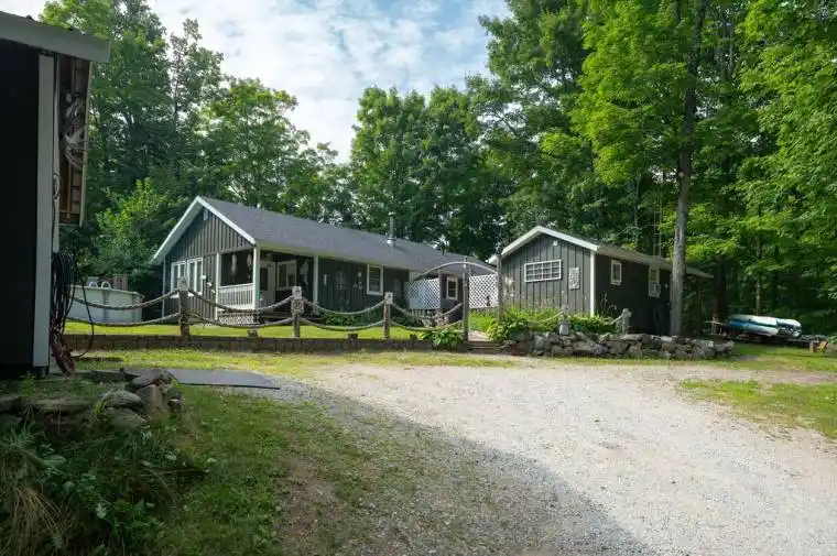 Welcome to Bolton Landing! Whether you’re dreaming of a peaceful cottage escape or planning your next chapter in a year-round home, this private oasis has it all. Tucked away on nearly 5 acres of wooded serenity, just a peaceful stroll or short quad ride to the deeded access at Bolton Lakes with a private community beach and dock, this property blends nature, comfort, and convenience. Inside, enjoy an open-concept layout with cozy in-floor heating, a propane fireplace, and a charming wood stove in the kitchen. The private primary suite with ensuite bath offers a restful retreat, while a separate bunkie provides extra space for guests or teens. Step outside and unwind in your pool and sauna, host family gatherings on the expansive deck, or tinker away in the detached garage, workshop, and drive shed. There’s even a 5th wheel trailer included for overflow visitors, with no shortage of space for family and friends. Located just 15 minutes from Highway 7 and the quaint village of Sharbot Lake, this property is ideal for anyone seeking a balanced lifestyle surrounded by nature with modern comforts and community perks. Live here year-round or retreat on weekends, its your choice. Come see what peaceful living really looks like.
