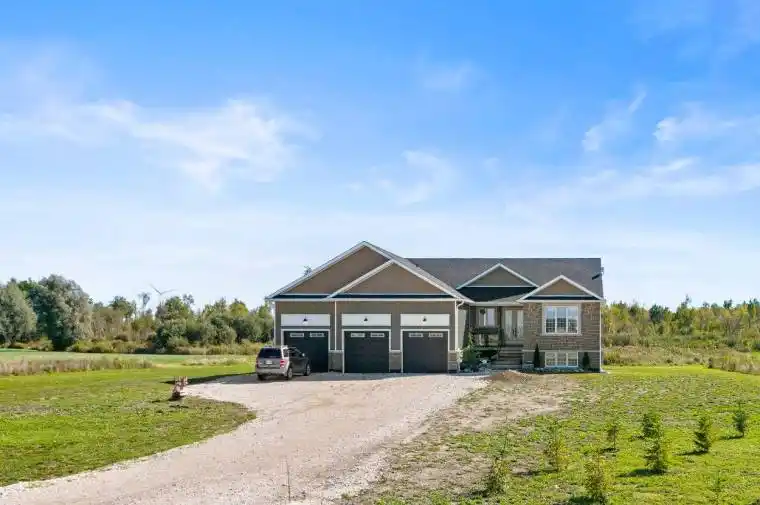 This exceptional 3-year-old custom-built home is a rare find, nestled on approximately 96 acres of breathtaking land that seamlessly blends privacy, luxury, and convenience. Spanning 4,400 sq ft, this residence is perfect for large families or multi-generational living. The main floor features stunning 9-foot coffered ceilings and expansive windows, creating an airy, grand ambiance throughout. Inside, you will find three spacious bedrooms, highlighted by a primary suite that boasts his-and-her closets and a luxurious 5-piece ensuite. The high-end kitchen is designed for chefs and entertainers alike, offering granite countertops, under-cabinet lighting, a breakfast bar, and a warming drawer. A deck off the kitchen extends your living space outdoors, providing the perfect setting for dining while taking in the sweeping views of the countryside. The home features luxury vinyl flooring throughout for a seamless look and feel. The fully finished basement, featuring 8-foot ceilings, adds additional living space with four bedrooms, an inviting family room, a second kitchen and two full bathrooms, ideal for guests or extended family. The basement also includes a rough-in for a stand-up washer/dryer tower, which the buyer can purchase and have installed by the sellers. This home has been thoughtfully upgraded with forced air heating and cooling, including an extra heat pump for year-round comfort. The upgraded garage features heating and air conditioning, while a loft above provides extra storage or potential development. A large pond at the back of the property offers a relaxing spot to enjoy nature during walks or hikes on your own land. Under the new provincial policy, the construction of a second dwelling is permitted on the property. For nature lovers, this home is a true retreat that offers unparalleled privacy and the tranquility of country living. It’s not just a home; it’s a sanctuary in the heart of the countryside!