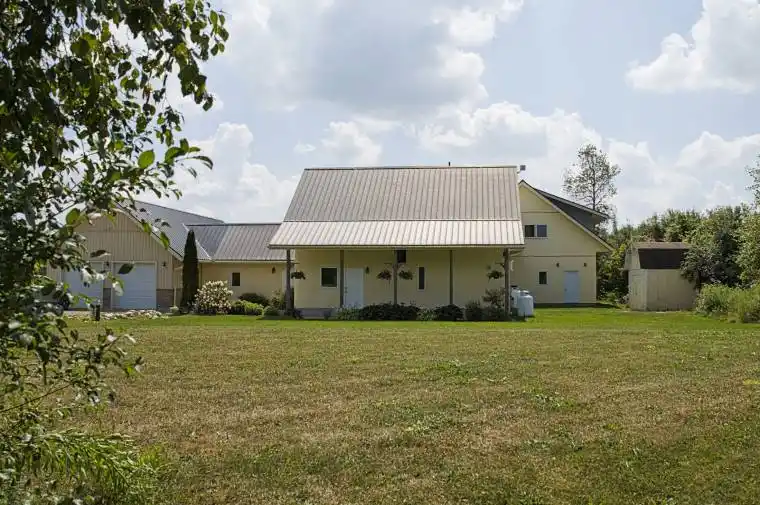 Discover the best of modern country living just 5 minutes from the small town charm of Grand Valley. Close to Luther Lake Conservation Lands ideal for canoeing & bird watching. Set on a peaceful rural 1 acre property on a paved road, this 4500 square foot home is energy efficient, passive solar and embraces sustainable living, blending modern comfort with environmentally responsible design. It is an ideal forever home for your family & extended family. Built with natural eco-friendly material including concrete, metal, wood, straw insulation & plaster & conventional construction. This property has a low-carbon footprint without sacrificing style or function. Constructed with premier planning, process & engineering standards. The thoughtfully designed layout offers a very spacious open airy main residence (could be 2 residences !!) a beautiful separate self contained 1 bedroom apartment with its own laundry. The 2 car attached garage is 30 ft. X 23 ft. PLUS an attached rear workshop/garage 17 ft. x 23 ft. with a rear roll up door. Parking for 8-10 cars. Large entry 20 ft. x 11 ft. Radiant in-floor heating & practical porcelain tile throughout the main floor. The reading area leads to a gym / home office & a L-shaped great room with an inviting wood stove & a spacious play area. The open concept design features deep window sills, built-in shelves, reclaimed elm & maple floors, 6 BDRMS., 4 bathrooms, 3 walkouts to the garden courtyard, solid wood doors, custom maple kitchen, walk-in pantry & pot lighting throughout!! Built with top quality materials starting from a concrete foundation, in floor radiant heat, framed construction, aluminum roof, high end fibreglass windows, R 40 walls & R 60 ceilings, 400 amp electrical service, 2 tankless hot water tanks w/ heat exchangers, 2 HRV’s & a Waterloo Biofilter Septic. The well has a constant pressure system. This home has a warm organic look, thick sculpted walls, deep window sills & a natural plaster finish.