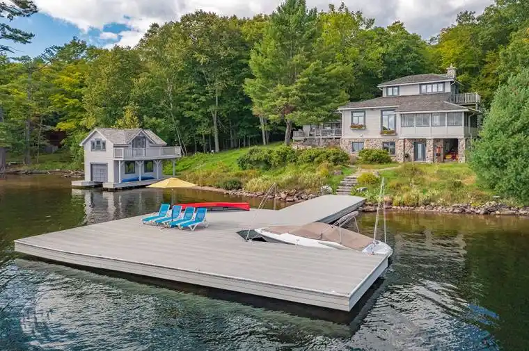 Elevate your lakeside lifestyle to unparalleled heights along Lake of Bays’s coveted shores. Ideally situated with sought-after southern exposure, this remarkable property boasts an impressive 332′ of frontage and 5.74 acres. For those who wish to have additional privacy, the adjacent vacant lot with 205′ of frontage and 3.32 acres is also available for purchase (MLS #X12102319). Upon entering the main cottage, you’ll love the sunlit kitchen with exquisite finishes and built-in appliances. The open-concept layout is a dream for those who love to entertain and the spacious sunroom offers additional space for your guests where they can soak in the mesmerizing lake views. This multi-level cottage ingeniously provides a thoughtful separation between the guest bedrooms, owners retreat and living space. The primary bedroom suite is perfectly tucked away, featuring a full ensuite bathroom, a walk-in closet, and a private balcony, affording you a personal retreat that’s second to none. The two additional bedrooms are located on the lower level, each with lake views and access to a full guest bathroom and a walkout from the family room to the lakeside. An independent secondary cottage is mere steps away, equipped with a full kitchen, a 3-piece bathroom, and two bedrooms, ensuring ample accommodations for your guests or family. At the water’s edge, a shallow, sandy entry to Lake of Bays beckons individuals of all ages, providing a safe and inviting place to wade into the crystal-clear waters. The extensive composite dock is your gateway to endless days basking in the warm sun, and as a bonus, a 2-storey boathouse not only safeguards your watercraft but also offers extra storage or accommodations. Completing this splendid package is a new single-car garage with large studio or gym space. Whether you aspire to make this your permanent residence or seasonal retreat, this property leaves no desire unfulfilled