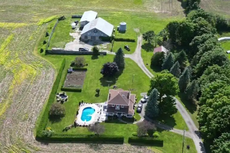 This stunning 99 acre farm property has been beautifully restored and updated. The country kitchen has a modern cooking range and a working woodstove – extra cooking surface & great ambiance & warmth for cold winter days. All wood floors (on 3 levels) have been lovingly refinished to original sheen. Second floor bathroom has a large corner jacuzzi tub and separate shower stall. The restored 3rd floor is a wonderful family room, playroom or guest suite with a sectional sofa, bed, dresser, sink and claw foot tub-set right under the skylight. Main floor laundry has a sink and toilet. The exterior is meticulously maintained! Plenty of perennial flower beds, a vegetable garden, fish pond, playhouse and an in-ground pool! Outbuildings include a drive shed, pole barn & a bank barn – lower level was used for cattle and the upper level has been the location of many Birthday and Anniversary Parties-and even a Wedding! Property has approximately 20 acres of mixed bush, a shallow pond (great for skating) and over 75 acres of workable land currently rented by a neighbouring farmer. A unique property-only owned by 3 families in over 100 years!