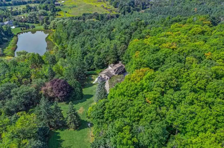Discover an unparalleled hilltop estate bordering Newmarket, offering a rare blend of seclusion and accessibility. Set on 18.79 majestic acres of rolling hills and mature forest, this private paradise is a world away, yet moments from city amenities. The residence is a masterpiece of Post & Beam construction, merging mid century character with sophisticated modern design. A welcoming foyer ushers you into voluminous, light filled interiors defined by exposed beams and rich hardwood floors. The heart of the home is the breathtaking Great Room, which boasts a commanding fieldstone fireplace that soars to meet the cathedral ceilings. This remarkable home features 5 bedrooms and 4.5 bathrooms, providing ample space for family and guests. A truly unique feature is the six acre sugar bush, complete with a fully equipped Sugar Shack, inviting you to craft your own maple syrup. This is more than a home it is a legacy property offering an enchanting connection to nature and an extraordinary lifestyle.