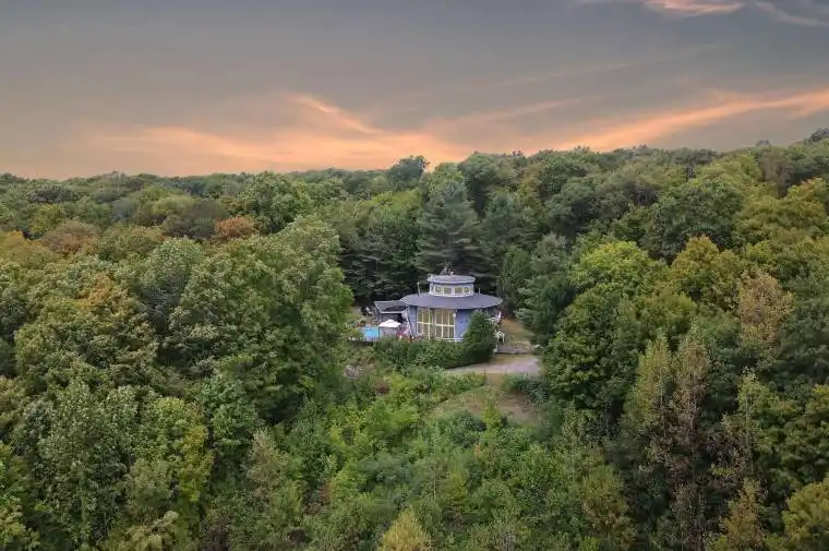 Attention all Architecture lovers! This 3,000+ sq. ft. Dodecagon home (12-sided) is a marvel of engineering. It starts with an inner core steel tube that runs from the basement to the top, with steel i-beams heading out from the centre to fully anchor the home. Inside you will find exquisite wood floating stairs, solid wood post and beam construction and an overhanging second floor open to the living/dining area below. All with exhilarating views that encompass all of Halls Lake and beyond. The second level also provides two additional hang-out areas, currently used as a games area and a music area. The centre tube provides access to the basement, which also has access from outside for the perfect workshop. Follow the spiral stairs in the tube from the second floor upward and discover the amazing solarium or copula with seating a full 360 degrees, topped off by a hot tub! An incredible feature. Balconies exit off each upstairs bedroom, and decks encircle the main floor. The centre piece of this home is the core steel tube, offering an amazing stone fireplace and a beautiful mural painted by Artist Lois Rod. The construction of this home is simply a study in engineering and amazingly built with longevity in mind. The outside offers a world to explore. Over 130 acres of managed forest with trails, a pond, a salt-water pool, beautiful perennial gardens, and abutting acres of Crown Land. All with a stunning vista that must be seen to be believed.