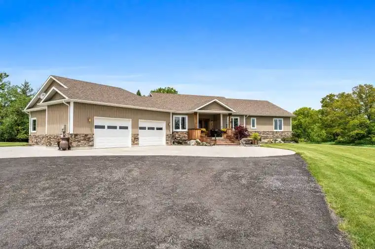 Set on 6.5 acres of landscaped privacy in sought-after Northumberland County, this custom 2016 bungalow blends luxury, function, and the best of country living. With nearly 3,000 sq. ft. of finished space and show-stopping outdoor amenities, every detail has been designed to impress. A 400-ft tree-lined drive welcomes you to a serene setting surrounded by over 1,500 trees and panoramic sunrise and sunset views. Inside, soaring 9-ft ceilings, an open-concept design, and a chefs kitchen with granite counters, stainless appliances, and a 9.4′ x 3′ island create the perfect space for entertaining. The primary suite offers a walkout to a covered porch, walk-in closet, heated ensuite floors, and direct access to the laundry. A propane fireplace and built-in speaker system add comfort and style to the main floor. The fully finished lower level is equally impressive, featuring luxury vinyl floors, wood-plank ceilings, a custom flagstone fireplace with live-edge seating, a concrete-top bar with barn board cabinetry and rain barrel sink, plus two bedrooms and a spa-like bathroom with rain shower and hidden shelving. Outdoors is your private retreat: a 33′ x 18′ saltwater pool heated with a wood-fired system, surrounded by 2,500 sq. ft. of decking and three covered lounge areas. Enjoy an outdoor shower, 10′ x 10′ bunkie, 30-ft firepit, personal golf green with four tee blocks, and a concrete apron to the garage. The heated, insulated 3-car garage includes a mezzanine, wheelchair ramp, and direct access to every level of the home. This is more than a home, it’s a lifestyle. Private, peaceful, and built for those who expect nothing less than extraordinary.