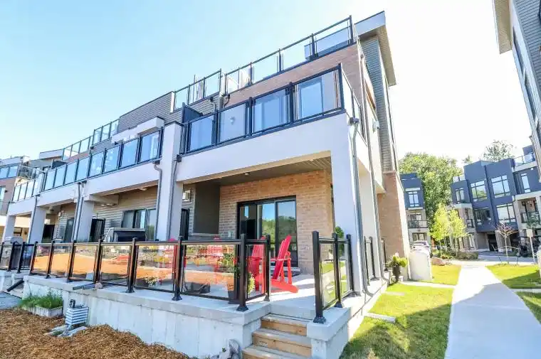 Rare End Unit Townhome with Georgian Bay Views. Welcome to this stunning rare end unit townhome located in the sought-after Residences of Oak Bay Golf & Marina Community. Perfectly positioned with captivating views of Oak Bay Marina and Georgian Bay, this three-year-old brick and vinyl home combines style, comfort, and resort-style amenities. Main Level: Double car garage, parking for two more cars in the driveway, with additional storage closet. Inside Tiled entry with coat closet and utility room. This Townhome has Hardwood flooring and power window blinds throughout. The Bright family room with sliding door walkout to patio overlooking the marina and Georgian Bay. Convenient two-piece powder room with tiled floors. Second Level: Open-concept living and dining room with propane fireplace and walkout to a spacious deck with spectacular western sunsets over the Bay. Modern kitchen featuring quartz countertops, slide-in propane stove, chimney exhaust fan, stainless steel inset sink, and island with breakfast bar. The Primary Suite is a spacious bedroom with a floor-to-ceiling walkout to a private balcony facing east for sunrise views. A Walk-in closet and luxurious 4-piece ensuite with soaker tub and glass walk-in shower. Third Level: The hallway has a walkout to another open deck with panoramic marina and Bay views. Two additional bedrooms: one overlooking the marina and Georgian Bay, the other facing east for morning sun. A 3-piece bathroom with tiled floors and glass walk-in shower. The Stacked Laundry Closet provides easy access. Lifestyle & Community: Enjoy resort-style living with access to an award-winning 18-hole golf course, clubhouse with outdoor pool, and just steps to the marina with boat slips for easy access to Georgian Bay. This immaculate, move-in-ready townhome offers a rare combination of modern finishes, breathtaking views, and community amenities, making it the perfect year-round home or cottage-country retreat.