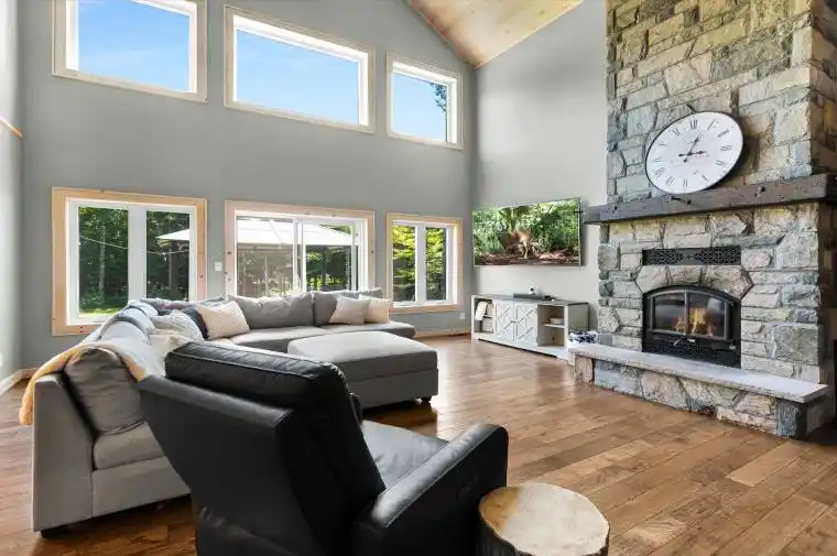 Welcome to your dream country retreat, where nature and luxury meet, just a short 10-minute drive to all the amenities of Bracebridge. This custom-built, two-storey home offers timeless appeal with striking Post & Beam accents, and exceptional craftsmanship throughout. This private and tranquil oasis has established trails throughout the mixed forest ideal for exploring the level and landscaped 9.9 acre parcel of land. Step inside and be captivated by the exquisite soaring two-storey stone wood-burning fireplace in Living Room showcased by solid red oak flooring milled from trees grown right on the property – truly a one-of-a-kind detail! Designed for families and professionals alike, the home features four spacious bedrooms, with main floor Primary Suite, complete with walk in closed and 5 piece ensuite, a massive home office, and 3 additional beautifully appointed bedrooms. Large banks of floor to ceiling windows flood the home with natural light and bring the outdoors in with all principal rooms commanding exceptional vistas. The open concept main floor is ideal for entertaining family and friends with the kitchen boasting ample cupboard space, additional pantry and 4 burner propane stove that will impress any home chef. Enjoy the numerous walk outs to multiple cedar decks which are ideal spaces to continue your entertaining, outdoor living or quiet times by the fire pit. This beautiful acreage offers gorgeous granite outcroppings, a variety of mixed bush and a calmness that will help you unwind from the most hectic of days. Added features include a Generac link on the hydro meter ensuring you’re ready for any power outages, ICF foundation, spray foam insulation interior and exterior walls. Lets not forget the garage/workshop with approx. 12-foot ceilings, radiant in-floor heating, and drywall finish, this space is as functional as it is comfortable for year-round use Don’t miss out on this exceptional house – truly a house for all seasons.