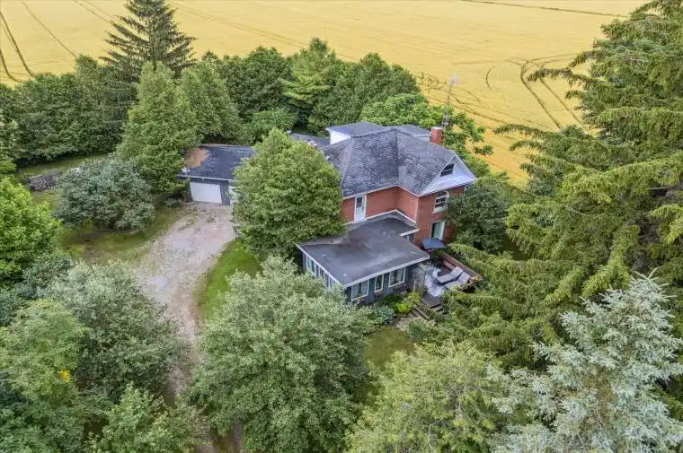 Charming Century Home on 1.3 Acres Country Living Minutes from Town! Enjoy the perfect blend of country charm and modern convenience in this beautifully renovated century home, set on a private 1.3-acre lot just five minutes from Elora and two minutes from Alma. A long driveway lined with mature walnut and apple trees welcomes you to this spacious four-bedroom home, offering plenty of space for family, guests, and entertaining. Enter through the double car garage and mudroom or via the covered porch into a tiled foyer. The sunny living room features hardwood floors, a cozy woodstove, and leads to a private study with built-in bookcases. Main floor updated 3-piece bath with glass shower. The thoughtfully designed kitchen features stainless steel appliances, engineered hardwood floors, ample cabinetry, and a second woodstove. A walk-in pantry/laundry room adds extra functionality. The light-filled family room (or formal dining room) features French doors opening to a large deck and expansive backyard. A main floor bedroom is ideal for guests or a home office. Upstairs, a renovated 5-piece bath includes a soaker tub and walk-in tiled shower. The spacious primary bedroom offers a walk-in closet and additional storage, while the second upstairs bedroom boasts original pine floors and great views. The third floor features a fourth bedroom and flexible loft space, perfect for a toy room for the kids or a private hangout for the teens. Situated on 1.3 private acres, with plenty of fruit and nut trees, many perennials throughout, room to grow vegetables, and the peace of mind of updated electrical, new propane furnace. All of this five minutes to Elora and two minutes to Alma. Come and explore this beautiful country property full of warmth and character, and find tranquility close to town!