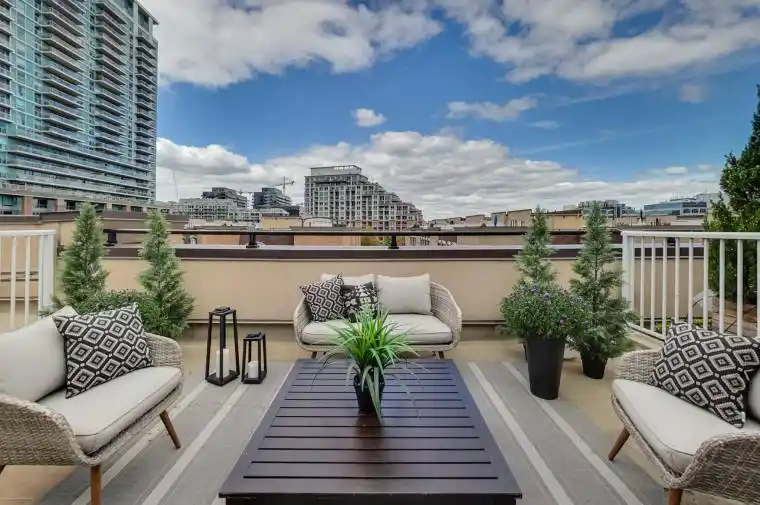 Almost 1,000 sq. ft. across three levels plus a private rooftop deck with a BBQ gas line and city views this Liberty Village townhouse is a smart step up from condo living. The main floor features an open kitchen, living, and dining area with windows overlooking a rose garden, along with a convenient powder room. Upstairs, two well-proportioned bedrooms – larger than the neighbourhood norm – share a full bathroom and an upgraded washer/dryer. The third level opens to a spacious roof terrace, ideal for barbecues, casual dinners, or unwinding with the skyline in view. Parking includes a built-in bike rack, and the oversized locker sits right beside the space for easy storage. The community is pet-friendly, with a dog park nearby. Move in and enjoy the space as it is, with the flexibility to update on your own timeline and make it truly yours.