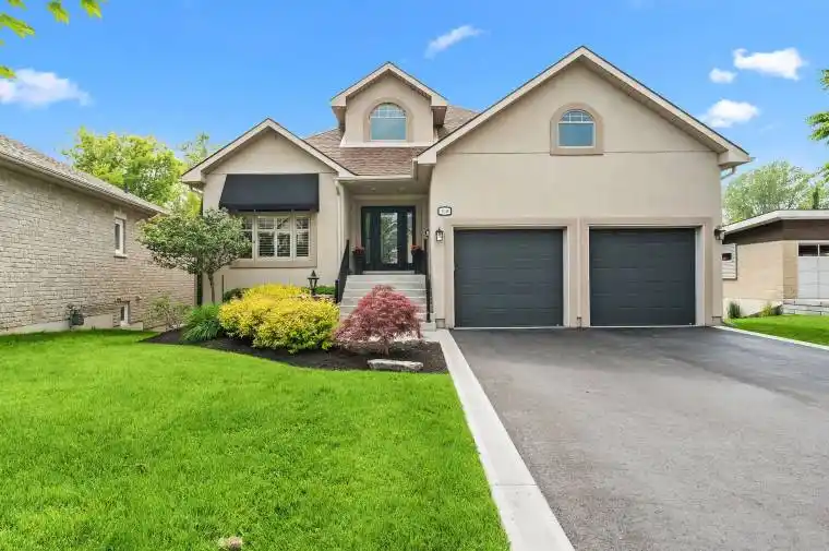 Welcome to this beautifully crafted custom home, ideally located in one of Kingston’s most exclusive neighbourhoods–just steps from Cataraqui Golf Course, hospitals, and scenic Lake Ontario Park. Offering over 1,690 sq. ft. of elegant living space, this meticulously maintained residence combines modern design with timeless comfort. The main floor features a great room with a custom stone fireplace, gleaming hardwood floors, vaulted ceilings, pot lights, and crown moulding throughout. The open-concept kitchen showcases granite counters, a ceramic backsplash, and a spacious dining area that flows seamlessly to the backyard deck perfect for entertaining. The primary suite offers a walk-in closet and an ensuite, while garden doors lead to a covered deck overlooking the private, landscaped yard. The lower level is beautifully finished with a family room and gas fireplace, an additional bedroom, and a 3-piece bath. Exterior highlights include a new driveway, front porch, curbs (2022), and roof shingles (2020). With over 3,200 sq. ft. of total living space, this home offers both sophistication and comfort in a highly sought-after central location. Recent mechanical updates include furnace (2018) and A/C (2019). Truly a rare opportunity to own a home of this caliber in Kingston’s finest area.