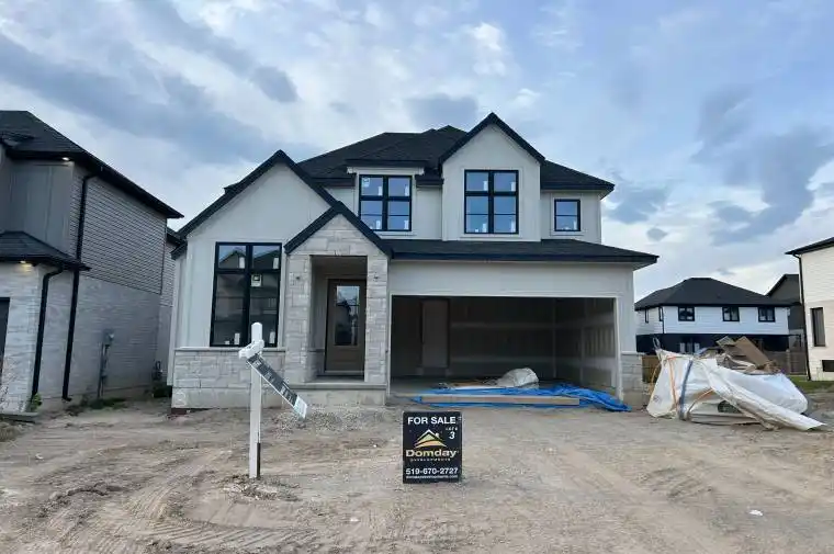 *BONUS* Separate side entrance to the finished lower level offers excellent rental or in-law suite potential. Welcome to The Villa Nouveau, a stunning 5-bedroom, 2-storey home by DOMDAY Developments, currently under construction in the desirable Warbler Woods community of West London. This thoughtfully designed home features 9-foot ceilings on the main floor and 8-foot ceilings upstairs, with a striking exterior of stone, modern siding, and brick for timeless curb appeal. The open-concept main level connects a stylish kitchen with walk-in pantry, bright dinette, and spacious family room, enhanced by large windows for natural light. Step out to the covered deck, perfect for outdoor dining and entertaining. A main-floor den and mudroom provide added flexibility and convenience. Upstairs, the primary suite offers a walk-in closet and a spa-inspired 5-piece ensuite. Three additional bedrooms, a full bath, and second-floor laundry complete this level. The finished lower level expands the living space with a rec room, roughed-in kitchen, laundry rough-in, 5th bedroom, full bath, and bonus room making it ideal for an in-law suite or income-generating rental unit. Showcasing high-end finishes throughout, The Villa Nouveau blends modern elegance, functionality, and quality craftsmanship all in a prime location near scenic trails, top-rated schools, and everyday amenities.