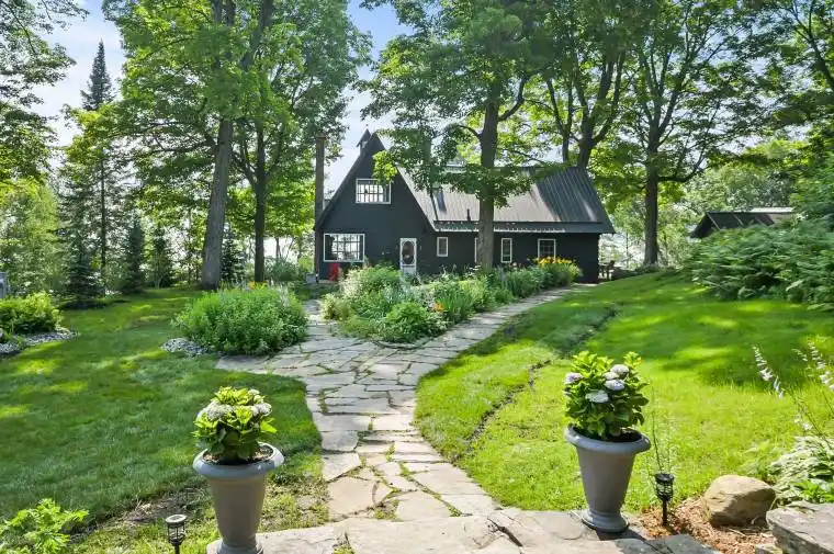 Step into a fairytale setting on the serene shores of Peninsula Lake, where timeless charm meets natural beauty. This turnkey 5-bed, 4-bath cottage is a rare blend of rustic elegance and refined comfort, nestled on 2.35 acres with 208 ft of pristine east-facing frontage. Winding flagstone paths, lush gardens, and towering maples surround you in enchantment-just minutes from Deerhurst Resort and downtown Huntsville by car or boat. The winterized 1800sqft main cottage welcomes you with warmth and character. A breathtaking great room features cathedral ceilings, floor-to-ceiling windows with long, panoramic lake views, and a charming wood-burning fireplace. A second fireplace adds ambiance to the dining room, with both spaces offering walkouts to the expansive landscape. The reimagined kitchen is thoughtfully designed for both charm and function – perfect for hosting loved ones. The main-floor primary suite includes a private 3-pc ensuite, in-suite laundry, and a nearby 2-pc powder room. Upstairs, three spacious bedrooms offer captivating lake views – one features a treehouse feel with a unique overlook to the great room. A full 4-pc bath completes the upper level. The spacious guest cottage features a generous bedroom with walkout and expansive lakeviews, a luxurious bathroom, cozy living area with a charming kitchenette, and an office nook perfect for quiet moments of inspiration. Outside, enjoy the large flagstone patio overlooking the lake – perfect for dinners, entertaining, or peaceful gatherings. Relax in the wood-burning sauna, gather by the lakeside fire pit, and take in the breathtaking, big lake views. Recent upgrades include new 22kw whole home Generac, new metal roof, new Makeway septic system, updated plumbing and electrical fixtures, a complete docking system, and a range of other thoughtful improvements that enhance both function and beauty. This storybook property is ready for its next chapter, where new memories and magical moments await.