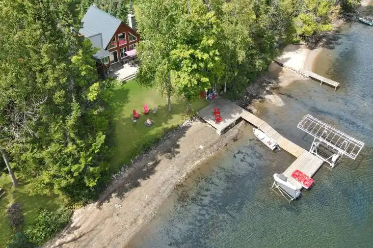 Discover your own slice of paradise at this exceptional lakefront property on Twelve Mile Lake- part of a 3 lake chain offering miles of boating. This 3-bedroom, 3-bathroom home offers the perfect blend of charm and modern comfort, making it an ideal year-round residence or cottage getaway. The heart of this home showcases an open-concept design seamlessly connecting the kitchen, dining room, and living room. Post and beam construction in the living room creates an impressive architectural statement, while the gorgeous stone fireplace serves as a stunning focal point in the living room, perfect for cozy evenings by the fire. The thoughtfully designed layout includes three comfortable bedrooms and three full bathrooms, with the primary bedroom featuring a luxurious ensuite bathroom complete with heated tile flooring for ultimate comfort. An additional loft space provides versatile options for guests, office space, or recreational activities. One of the home’s most captivating features is the screened-in sunroom, offering breathtaking views of Twelve Mile Lake. The property boasts impressive outdoor facilities including a substantial heated workshop equipped with in-floor radiant heating, combined with a spacious 2-car garage that provides ample storage and additional workspace. The beautifully maintained, level lot gently slopes toward the water, leading to an exceptional sandy waterfront that’s perfect for swimming, sunbathing, and water activities. The property includes a charming bunkie positioned near the water’s edge, offering additional sleeping quarters for guests or a peaceful retreat for relaxation, while the natural sand beach provides easy water access and creates the perfect setting for family gatherings, entertaining, or simply enjoying the tranquil lake lifestyle.This property combines luxury living with the serenity of lakefront life, offering an opportunity to own a piece of Twelve Mile Lake’s coveted shoreline.