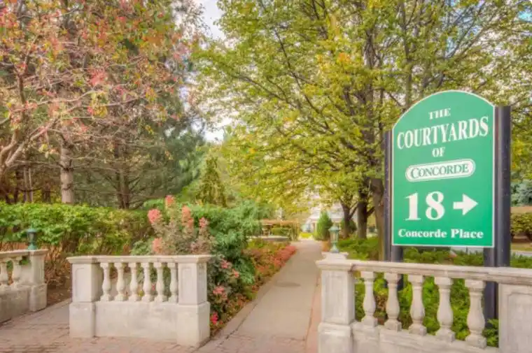 Spacious and well-designed 2+1 bedroom condo in the highly desirable Courtyards of Concorde. Situated at the end of a quiet cul-de-sac, withTTC right at your doorstep, just minutes to the DVP, and a quick commute downtown. The upcoming Eglinton Crosstown LRT will add even more convenience.This move-in ready unit features large principal rooms, hardwood floors, paint throughout, and a coveted split-bedroom layout for optimal privacy. Enjoy sunny views of the garden and front of building from the Juliette balcony. The second bedroom includes a built-in vanity/office space that can easily be converted back to a double closet. A separate laundry room off the kitchen doubles as pantry/storage.Owned parking and locker included.Building amenities rival a 5-star resort: indoor saltwater pool and whirlpool, gym, billiards and card rooms, workshop, guest suite, elegant party room with full kitchen and dance floor, gas fireplace, and terrace. Additional features include a library, tennis court, car wash bay, fenced dog run, garden plots, potting room, on-site superintendent, property manager, and 24-hour concierge/security.Residents enjoy a vibrant community with an active social committee hosting cultural events, dinners, annual BBQs, aqua-fit, stretch and exercise classes, book clubs, movie nights, and more. Walk to groceries, cafés, and the Aga Khan Cultural Centre. Minutes to Shops at Don Mills with restaurants, VIP theatre, and boutiques. Quick access to DVP/401 and excellent transit connections.