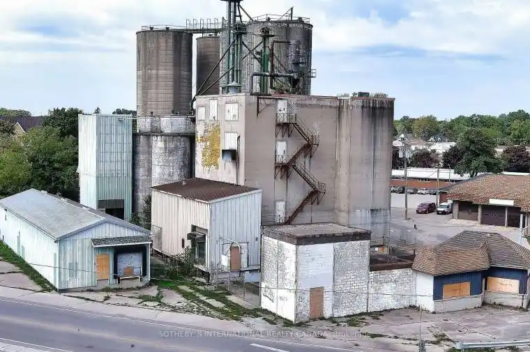 A unique opportunity in Downtown Strathroy, this 0.59-acre property with approximately 12,000 sq. ft. of production space offers excellent potential as a flour mill, grain mill, or brewery. The site includes a mill with a capacity of roughly 100 tons of flour per day, four silos (1,350 tons each), six transitional silos, and two large storage/warehouse buildings leased from CN Railway. The sale includes the real estate and existing flour mill equipment, with brewery equipment available for purchase separately, allowing buyers the flexibility to revive milling operations, expand into brewing or distilling, or adapt the facility to suit their business vision.