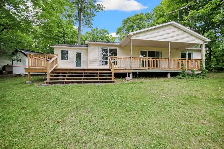 Rare opportunity to own a stunning year-round waterfront bungalow at Pickerel Point. 2 acres with 450′ of private shoreline on Mississippi Lake, just 40 minutes from Ottawa. This beautifully treed lot offers incredible privacy, wonderful beach area, dock and breathtaking water & sunrise views. Renovated in 2018, the home features an open-concept living and dining area centered around a cozy wood-burning heatalator fireplace. The modern white kitchen includes a charming farmhouse-style ceramic double sink, stainless steel appliances (fridge, stove, custom hood fan, and dishwasher), and overlooks the peaceful front yard.The spacious primary bedroom boasts a large walk-in closet, while the second bedroom is equipped with a Murphy bed and built-in armoire, making it versatile for guests or home office use. Step through the patio doors to a newer 41′ deck (2023), ideal for entertaining or relaxing while enjoying panoramic lake views.Additional features include an oversized, heated 2-car garage with ample room for vehicles and workshop space. Plenty of parking for Guests and friends. The home is serviced by a drilled well (148′ deep), a new septic system (2020), and a dry crawlspace housing a propane furnace (2015) ,water treatment, and central air. Rough-in for a backup generator is available. A convenient mudroom entry from the driveway offers a stackable washer/dryer and utility sink.Large 2nd Mudroom off deck with huge closet is perfect for coming in from lake. Updates include: furnace (2015), heat exchanger (2020), roof (2016/17), full house reno (2016), kitchen reno (2018), and septic system (2020). Dock at the waters edge provides excellent swimming, boating, and year-round enjoyment. Located on a privately maintained road with many year-round residents; Cottage Association fee $400/year. A rare and peaceful retreat combining cottage charm with modern convenience.24 hours on all offers.