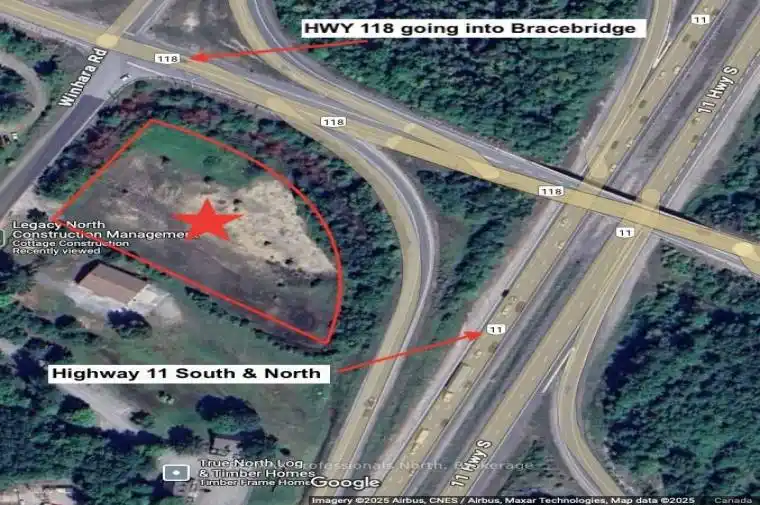 Prime 2.48-acre commercial property located at the high-traffic intersection of Winhara Road and Highway 118 in Bracebridge. Offering exceptional exposure and visibility, this property also fronts directly onto Highway 11, providing easy access and outstanding promotional potential. Zoned for a wide range of commercial uses, this site is ideal for businesses seeking flexibility and growth. The owners are open to both short-term and long-term lease arrangements from a simple storage yard setup to more extensive development opportunities based on tenant needs. Use address 1724 Winhara on GPS to find property. Vacant property is to the left when looking at 1724.