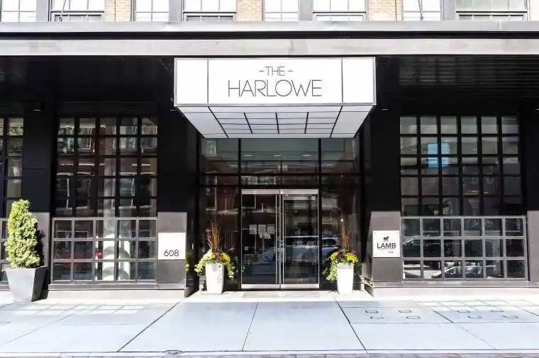 Welcome To The Harlowe! Furnished Ready To Move-In One Bedrm + Den. Quality Modern Features & Finishes Include Stainless Steel Appliances, Exposed 9 Feet Concrete Feature Walls & Ceiling, Stone Surface Counters, Engineered Wood Flooring, Floor-To-Ceiling Windows & More. Unbeatable Location Just Off Queen Street West Strip. Walk Out From Living Room To Balcony With Bbq Hookup! Large Windows Let In Tons Of Light. Shopping, Restaurants, Bars King/Queen Street Transit.